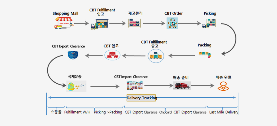 상품 보관 > CBT 출고 오더 > Picking > Packing > 포장 > CBT 수출 통관 > 국제운송 > CBT 수입통관> Last Mile Delivery>Digital Single window 실시간 정보 제공